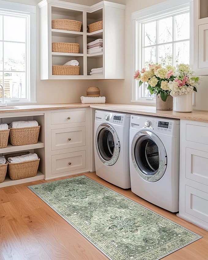 Area Rugs 2'x6' Washable Non-Slip, Floral Vintage Distress Print Pattern Medallion Carpet for Living Room Bedroom Dining Room, Dark Green Gray