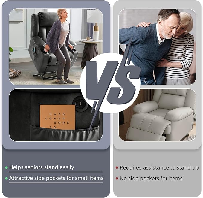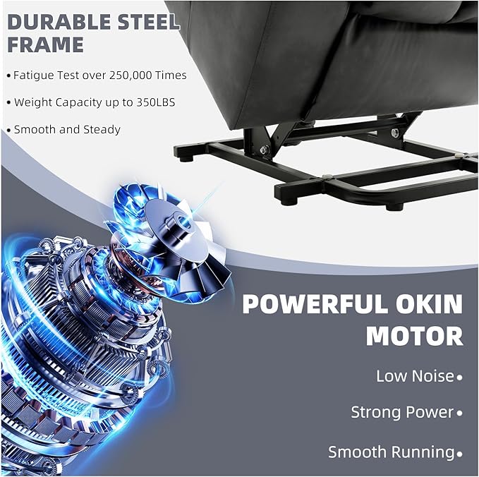 - [Electric lifting and standing assistance]Our balance lifting mechanism is driven by a powerful German OKIN motor, providing seamless standing assistance. Smoothly enhancing the overall stability of the chair, allowing users to effortlessly ascend without putting pressure on their back or knees. This feature is particularly beneficial for elderly people, pregnant women, or those who have difficulty standing from a sitting position