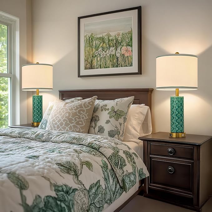 Set of 2 Table Lamp for Living Room Bedroom Farmhouse,26'' Touch Control Bedroom Turquoise Ceramic Lamps 3-Way Dimmable Bedside Lamps with USB A+C Ports Linen Shade for Home
