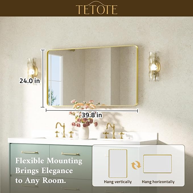 TETOTE Brushed Gold Bathroom Mirror 40 x 24 Gold Metal Framed Bathroom Mirror, Tempered Glass, Modern Farmhouse Wall Mounted Mirror for Decorative(Horizontal/Vertical)