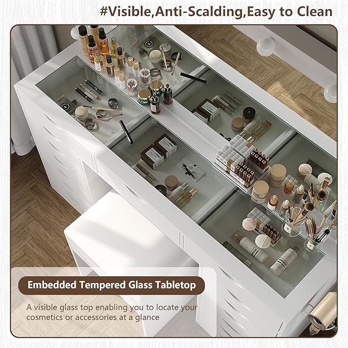 - 15 Spacious Drawers:Tired of cluttered beauty products? This vanity desk features 15 deep drawers to neatly store all your cosmetics, brushes, and accessories. Keep your space tidy while adding a chic, stylish focal point to your bedroom or dressing area