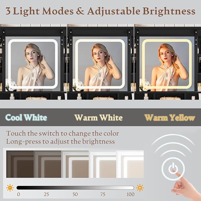 - 【3 Lighting Modes & Brightness Adjustable】This make up vanity features a large LED mirror with 3 color modes (warm; natural; cool), which is safer than ordinary light bulbs. You can change the color mode by pressing the touch switch, or adjust the brightness by long-pressing the touch switch