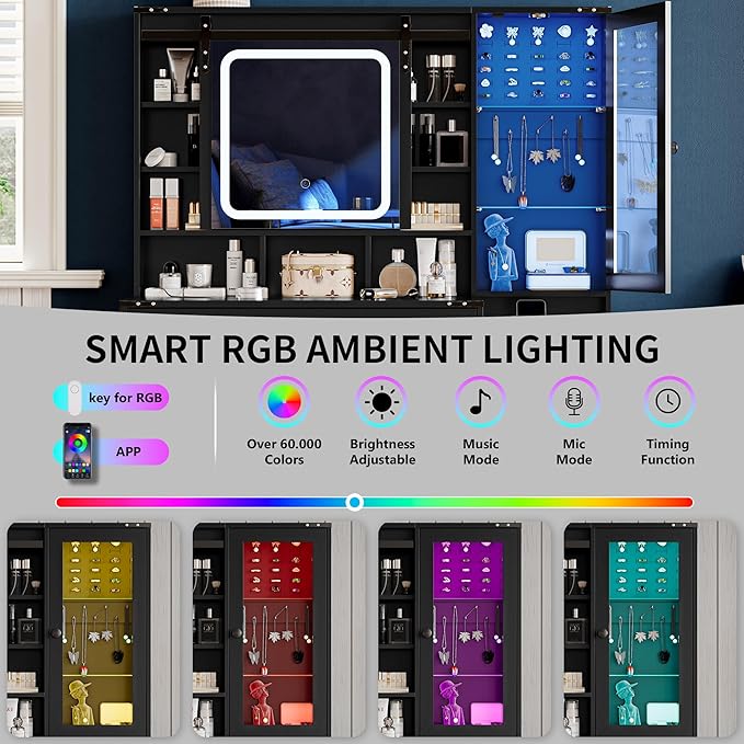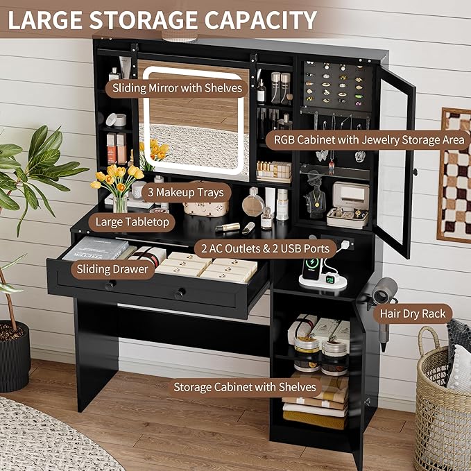 Makeup Vanity Desk with Sliding Mirror and Lights, Farmhouse Vanity Table Set with Power Outlet & RGB Cabinet, Dressing Table with Storage Drawers & Shelves for Kids Girls Women Bedroom, Black