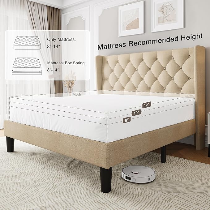Queen Size Upholstered Bed Frame with Wingback Headboard, Fabric Linen Platform Bed, 8" Under Bed Storage, Wooden and Metal Slats Support, Noise Free, No Box Spring Needed, Beige