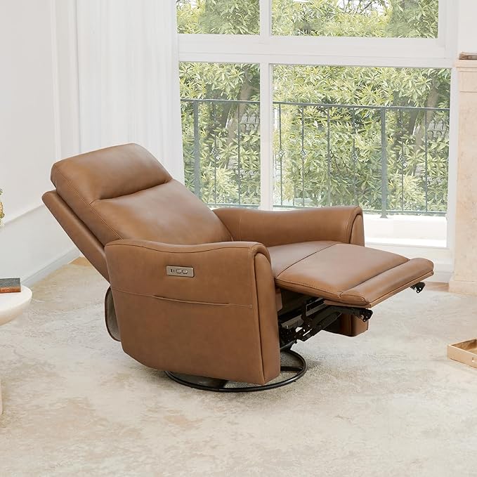 Watson & Whitely Genuine Leather Power Recliner Chairs for Adults, Swivel Glider Recliner Chair for Living Room with Charging Ports, Saddle
