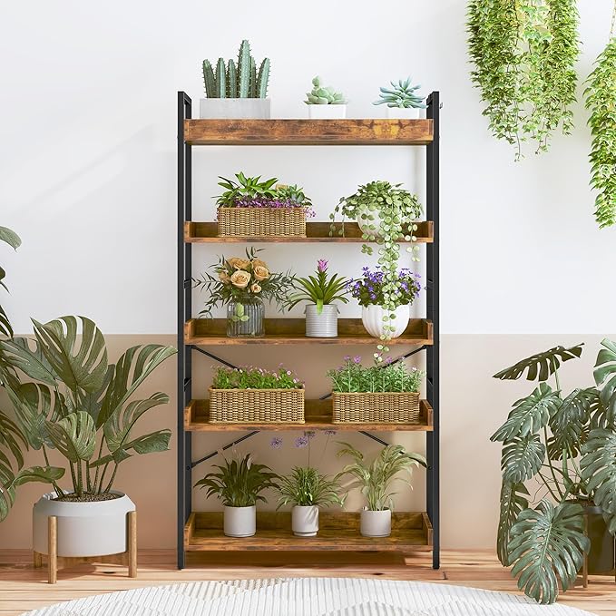 - 【8 Storage Hooks & Anti-Falling】The 5 tier bookshelf have different iron frame designs on each side, providing versatile storage options for products of various heights including books and ornaments. Additionally, 8 multipurpose hooks are included to hang headphones, toys, or other small decor.