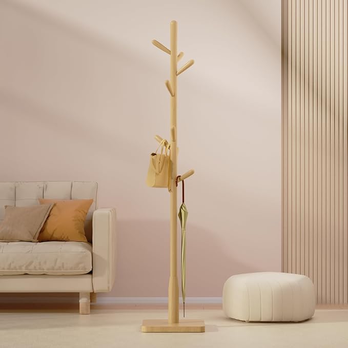 Solid Wood Square Base Coat Rack, Free Standing Hall Coat Tree with 8 Hooks(+2 spare) for Coats, Hats, Bags, Purses, for Entryway, Hallway, Rubberwood Hooks,Base and Pole,(Square Base, Natural Beige)
