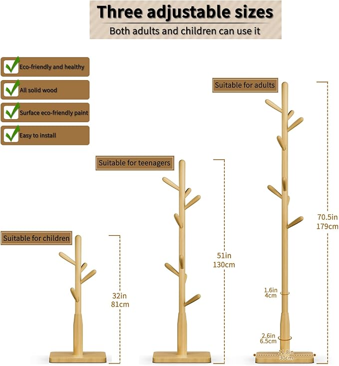 - 【Height-Adjustable Desin】Our wooden coat rack offers versatility with three height settings, respectively 32", 51", 70.5" high,achieved by simply adjusting the number of main rods. catering to every family member's needs.