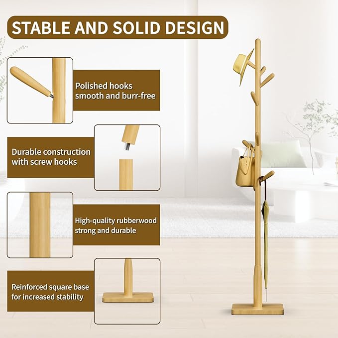 - 【Premium Material】Awatiwa wooden coat rack is made of high-quality Rubber wood and Solid Wood Square Base for optimal stability that supports multiple garments and outerwear.