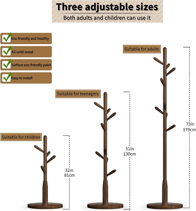 - 【Height-Adjustable Desin】Our wooden coat rack offers versatility with three height settings, respectively 32", 51", 70.5" high,achieved by simply adjusting the number of main rods. catering to every family member's needs.