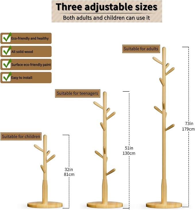 - 【Height-Adjustable Desin】Our wooden coat rack offers versatility with three height settings, respectively 32", 51", 70.5" high,achieved by simply adjusting the number of main rods. catering to every family member's needs.