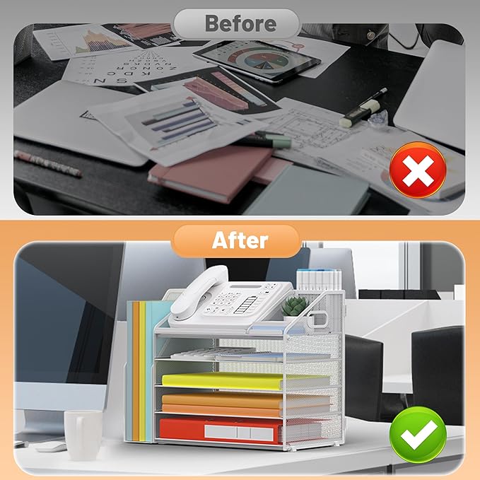 - 5 Tier Organization with Pen Holder: This White desk organizer boasts a 5-tier design for efficient sorting of your papers, letters, and other office supplies, along with a dedicated pen holder. It's perfect for maintaining a tidy and uncluttered workspace. The desk file organizer is an essential desk accessory that contributes to an orderly and professional atmosphere