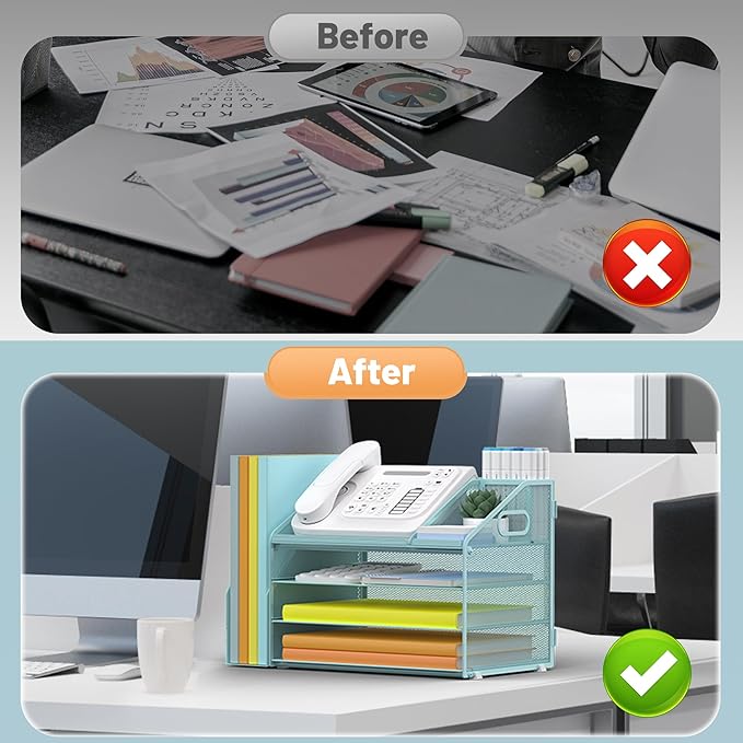 - 4 Tier Organization with Pen Holder: This Blue desk organizer boasts a 4-tier design for efficient sorting of your papers, letters, and other office supplies, along with a dedicated pen holder. It's perfect for maintaining a tidy and uncluttered workspace. The desk file organizer is an essential desk accessory that contributes to an orderly and professional atmosphere