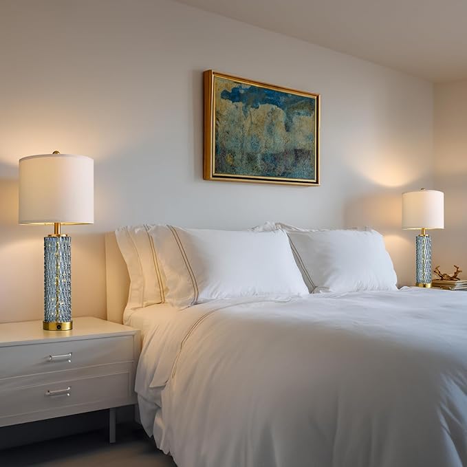 - Classic and Luxury Design Lamps: These bedroom table lamps are 27.75'' high and come in a set of 2. With a luxury look and simple design, great for home decor. The exquisite blue crystal night light show the gorgeous temperament, decorate your home and create a comfortable and romantic atmosphere. Perfect for bedside tables, living room, and bedrooms