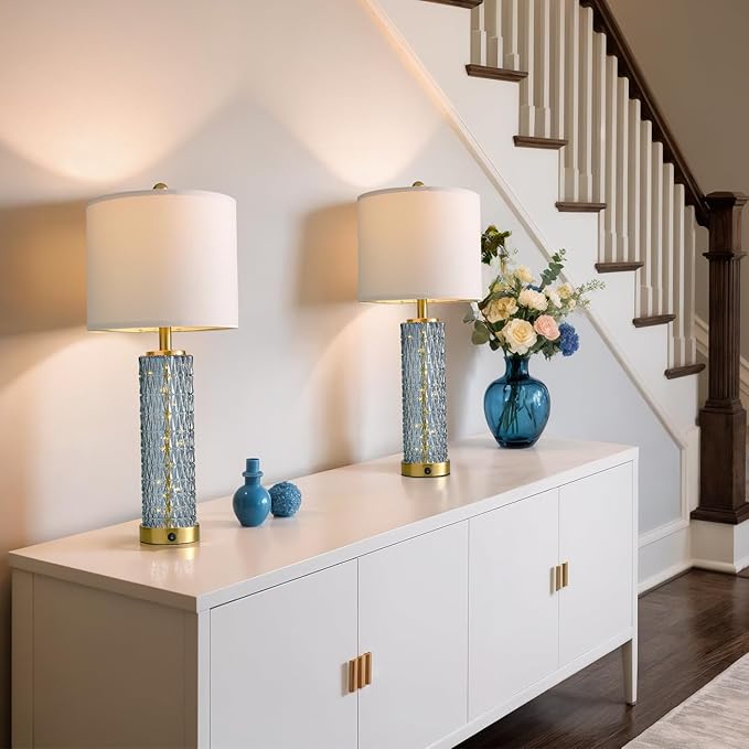 Oneach 27.75” Table Lamps Set of 2, Blue Modern Bedside Lamp with LED Night Light, USB A+C, Glass Lamps for Living Room, Bedroom, Nightstand, Office, End Table (2 Bulbs Included)