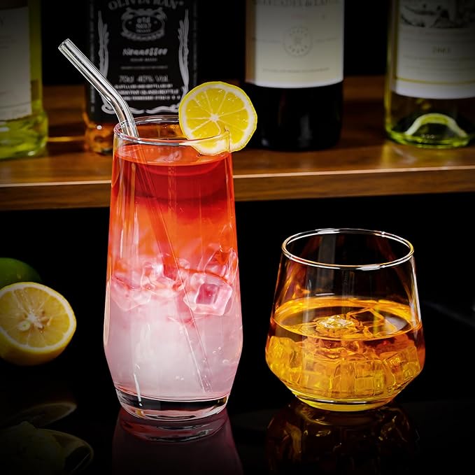 Drinking Glasses Set of 8,Clear 13 oz & 18oz Crystal Glass Cups,Drinkware Glassware,Highball Water Tumbler,Short Stemless Wine Glasses,for Beer,Cocktail,Whiskey,Juice and Various Mixed Drinks