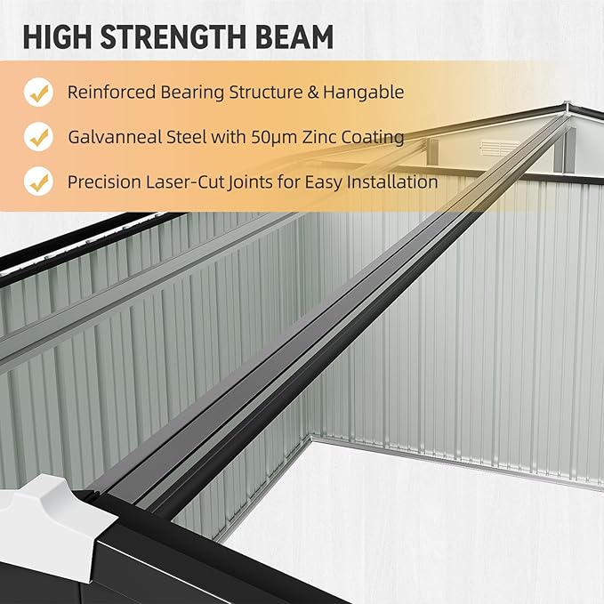 - Quality Floor Frame & Galvanized Steel Construction: Crafted with thick galvanized steel panels and reinforced structural engineering, this metal shed delivers exceptional durability. The anti-rust powder-coated surface combined with a 15mm interlocking plastic floor (woodgrain texture) ensures 360° moisture resistance while maintaining floor flatness. In addition, the floor supports a load-bearing capacity of 82 pounds per cubic foot, making it easy to hold heavy machinery