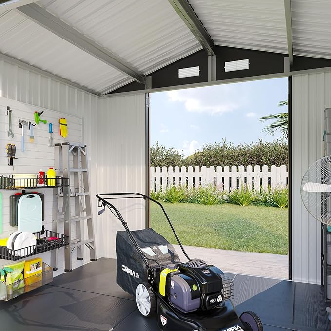 - Dual-Door Accessibility & Smart Ventilation Design: Features double front doors for effortless storage of bulky items like bicycles or lawn mowers. The integrated top ventilation vents regulate airflow to prevent condensation, keeping tools rust-free. Stainless steel latch locks and reinforced hinges provide security against theft and animal intrusion