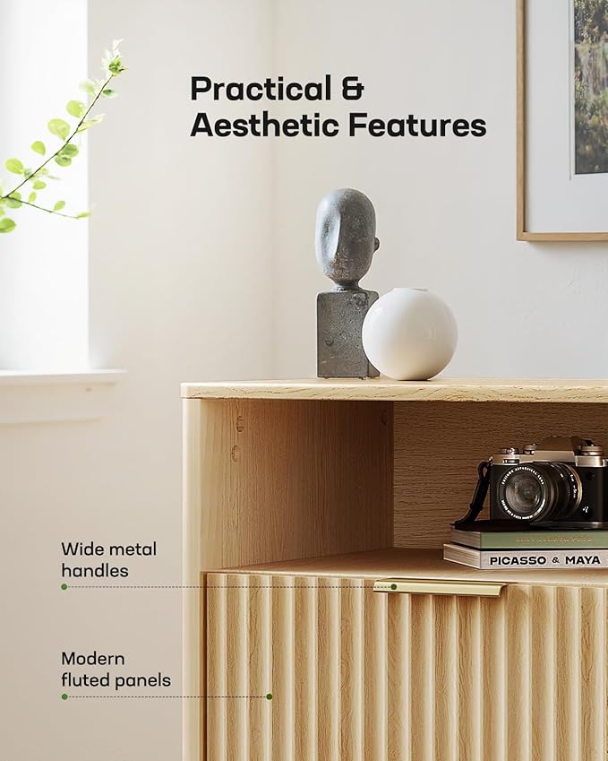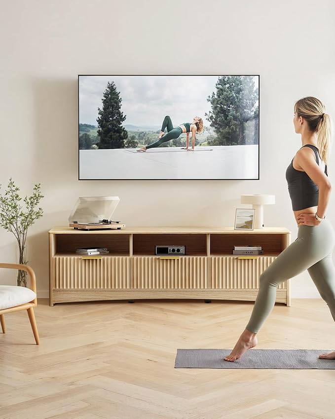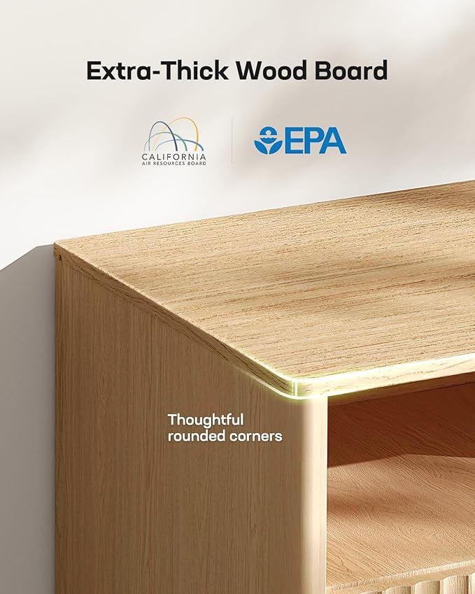 - Durable P2 Engineered Wood: Crafted from sturdy P2 engineered wood, this TV stand for living room combines strength and style. The modern design of entertainment center features rounded corners for added security and fluted panels for a sleek, contemporary look. This thoughtful design is not only practical but also versatile, effortlessly complementing any living space décor.
