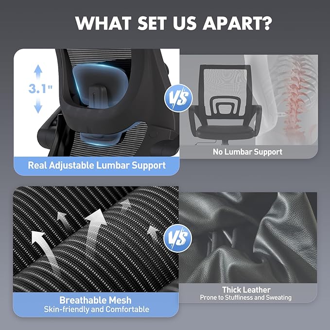 - 【Tailored Comfort from 9 to 5 – and Beyond】 Enjoy next-level support with an adjustable headrest, flip-up arms, and a high back mesh design. Whether you’re working, studying, or gaming, this ergonomic office chair adapts to your needs with rocking functionality and height adjustment that keep you relaxed and focused.