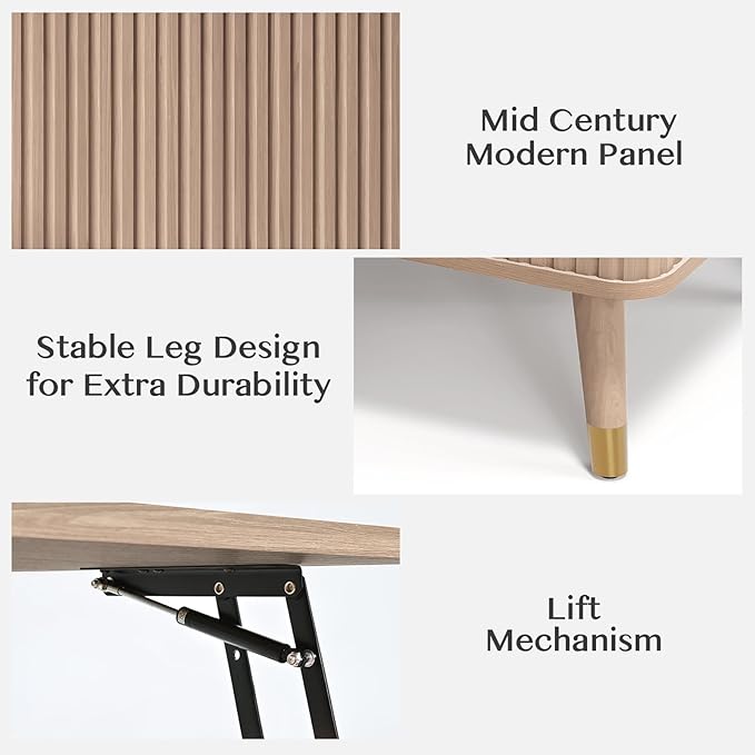 Lift Top Coffee Table with Storage,Mid Century Modern Coffee Table,Fluted Wood Rectangle Center Table for Living Room,Home Office,Natural Oak
