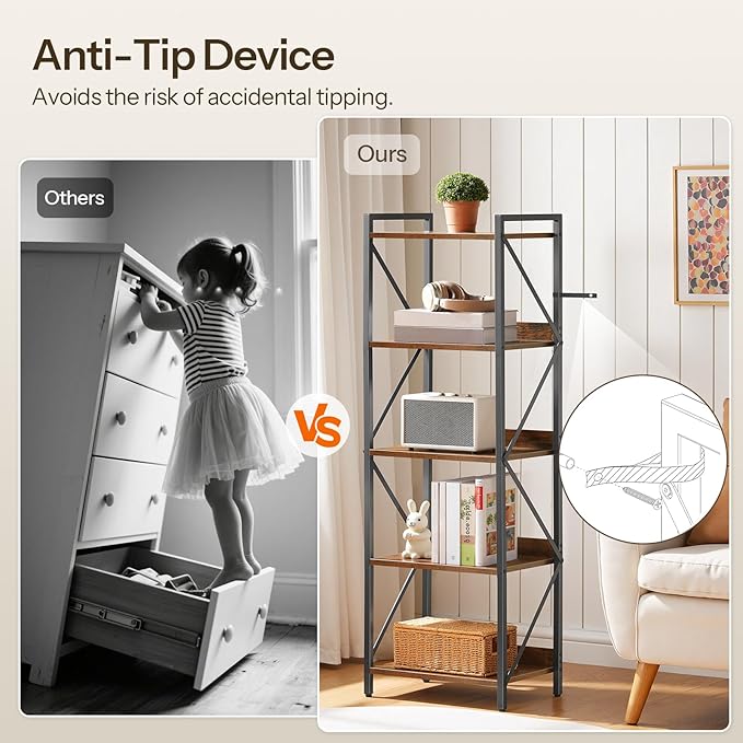 - Sturdy Construction: Made of quality particleboard and a metal frame, each shelf can support up to 40 pounds. The anti-tip device and adjustable feet add extra stability, protecting your books and decorations