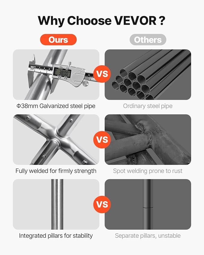 - Strong and Durable Materials: Made with galvanized steel pipes, the frame resists rust. The car canopy comes with alloy steel frame that is stronger and more durable than regular steel, able to withstand higher wind pressure and heavier weight, ensuring long-lasting use. Equipped with wind ropes and ground stakes for added stability in windy conditions.