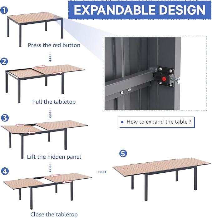 - 【EASY CLEANING & LOW MAINTENANCE】: The outdoor patio table and chairs perfectly highlight your patio or poolside décor. The rectangle expandable table allows you to place drinks, meals, or decorative items on top and clear up the water stain in one minute. Cushions with removable covers make cleaning and maintenance easier.