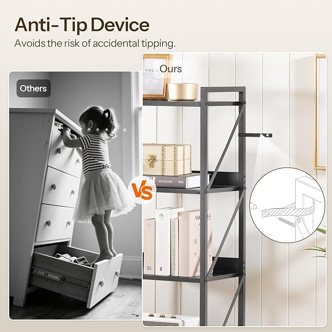 - Sturdy Construction: Made of quality particleboard and a metal frame, each shelf can support up to 40 pounds. The anti-tip device and adjustable feet add extra stability, protecting your books and decorations