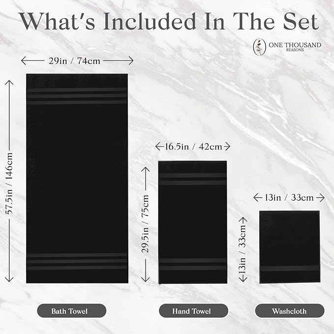 Zero Twist Bathroom Towel Set - Luxury Bath Towel Sets for Bathroom, Hands, and Washcloths - Quick Dry and Absorbent - 6 Pieces, 3 Stripe, Black