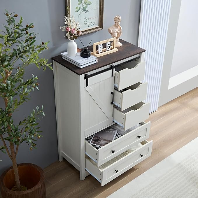 White Dresser for Bedroom with 5 Drawers, 48" Tall w/Sliding Barn Door, Farmhouse 5 Chest of Drawers for Bedroom, Hallway, Living Room, Dining Room, Antique White