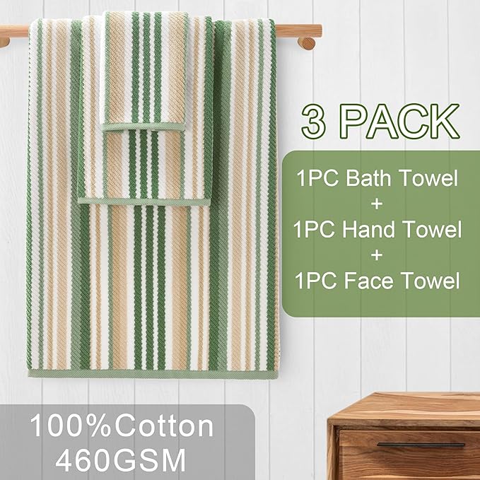 Green Striped Towels - 100% Cotton, Quick Dry, Soft & Absorbent, 3PC Luxury Towels Set (Bath 28"x52", Hand 16"x27", Wash Cloth 13"x13"), Stripe Shower Towel with Hanging Loop, Sage and Beige