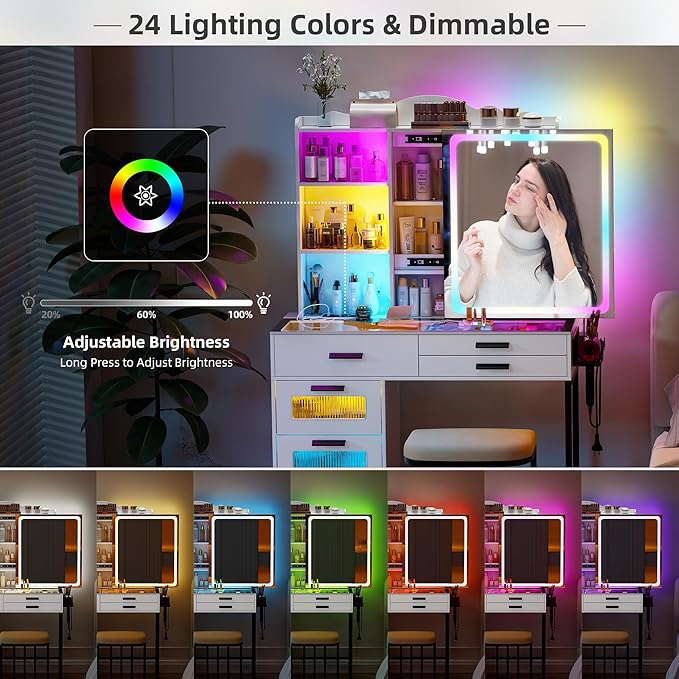 - 【RGB Color Lighting】This vanity desk features 24 static and 7 dynamic RGB modes.You can adjust the multiple colors or brightness according to different scenes and match your different makeup needs