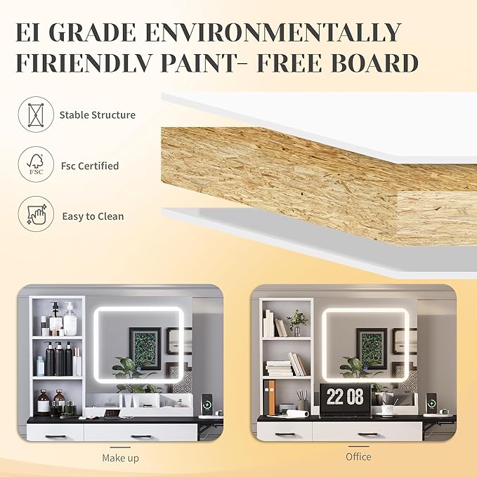 - 【Large Mirror with Light】This vanity desk features a large makeup mirror equipped with LED lights that offer three color modes (natural, warm, and cool light). Each mode allows you to adjust the brightness to suit your needs, ensuring perfect lighting for makeup application, skincare routines, or hairstyling.