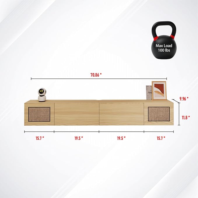 - DURABLE PLYWOOD CONSTRUCTION: Made from sturdy plywood for enhanced stability and long-lasting use. The natural finish on the floating tv cabinet adds organic warmth, while the floating structure supports most TVs and media devices.