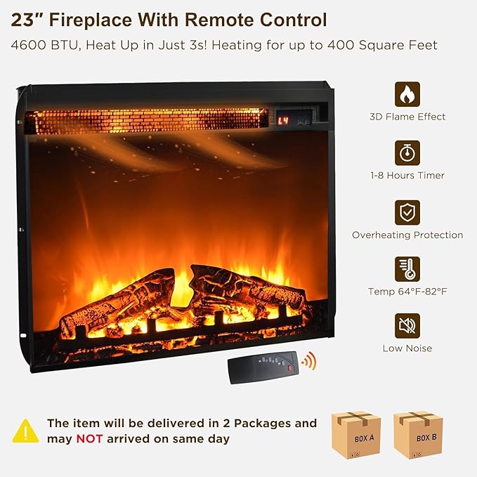 - 23 Inch Electric Fireplace with Remote Control: OKD fireplace heaters feature realistic 3D flame effects, glowing logs, and embers. No firewood, no dust, no smoke, and no cleanup, creating a clean and cozy relaxing space for you. The faux flame effect can be burned with or without heat, creating a warm and dreamlike atmosphere all year round. You can freely control the power switch and easily adjust the flame brightness, temperature, and timer with the included remote control or operating panel