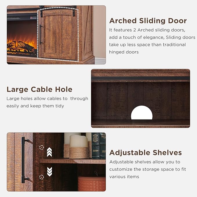 - Exquisite Farmhouse Fireplace TV Stand: OKD Fireplace tv stand features an exquisite sliding arched door and retro metal decor. Its unique distressed finish is wonderfully eye-catching, and it has natural variations in grain, color, and texture, giving every piece a unique look, and easily creating a rustic, charming, cozy living room. Matches perfectly with other furniture.