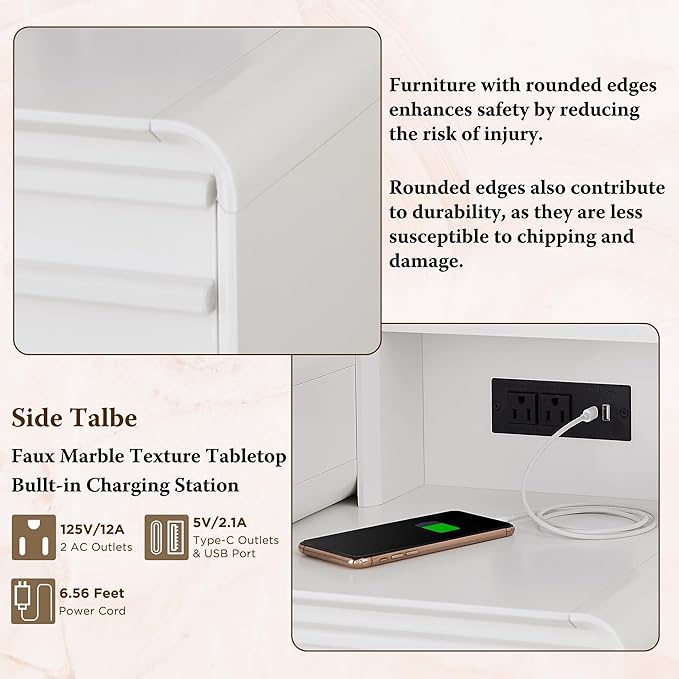- 4. 【Dual USB-C Fast Charge Hub & Appliance-Ready Outlets】Integrated 2x USB-C ports (20W PD) and 2x grounded AC outlets on the right panel (UL-certified) power curlers/hair tools without cluttering the desktop. The fire-retardant PVC cable management tray (behind the cabinet) organizes devices safely—2X faster charging vs. standard USB 2.0.