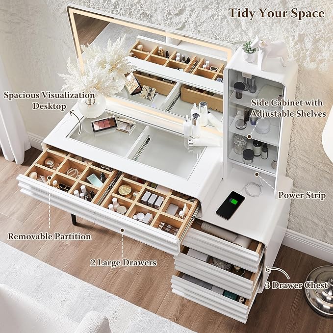 - 【Customizable 7-Zone Mega Storage System】Maximize organization with 2 deep drawers (15"x12") featuring removable dividers for palettes/brushes, 3 felt-lined slim drawers (9"x6") for lipsticks/rings, and a lockable cabinet (20" height) with 3 height-adjustable glass shelves (holds tall skincare bottles). The 5mm tempered glass tabletop reveals contents through its anti-fingerprint crystal surface, while hidden cable cutouts keep cords tidy.