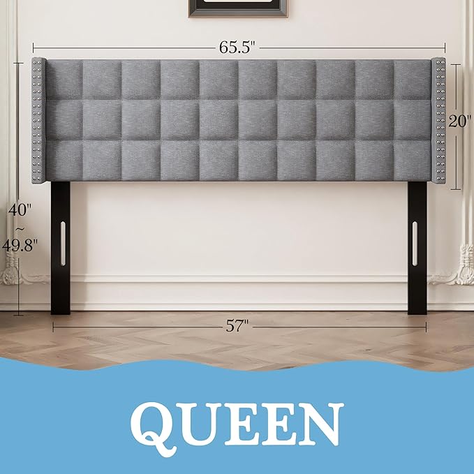 VECELO Headboard Queen Size, Linen Upholstered Headboards Only with Nailhead Trim Wingback, Square Stitched Design, Adjustable Height from 40" to 49.8", Light Grey