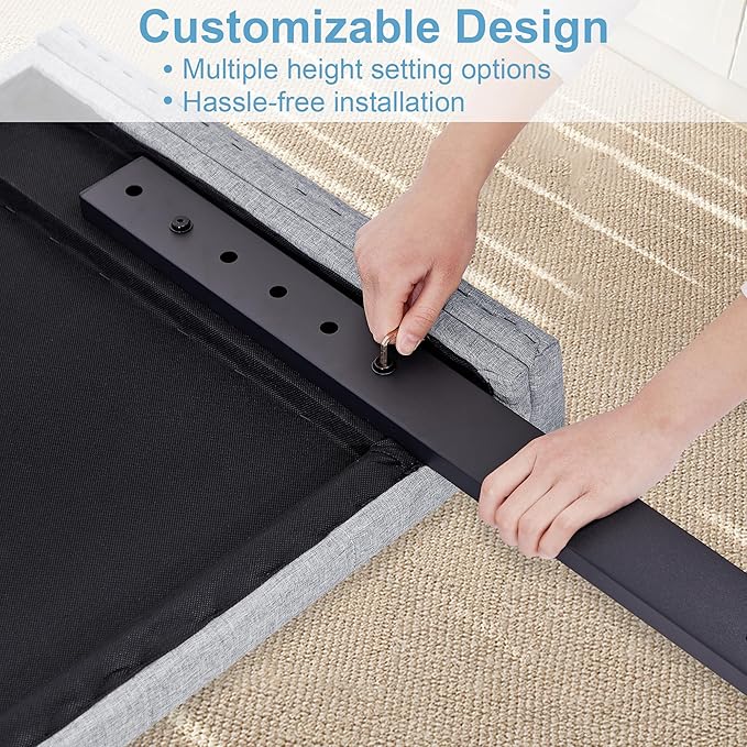 - 【Adjustable Height】The queen headboard is available in 6 optional adjustable heights. There are 2 sets of pre-drilled holes at the back, and 6 height-adjustable mounting positions from 40" to 49.8" in 3" increments, to fit most bed frames and bases.