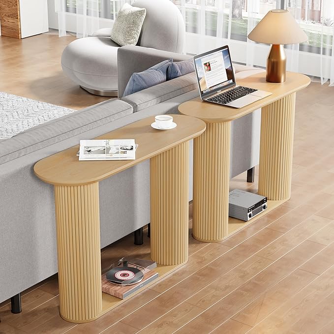 Fluted Console Table, Farmhouse Oval Curved Entryway Table with Storage and Fluted Wood Legs, Narrow Sofa Table Small Long Entry Table for Entrance, Hallway, Living Room (Natural)