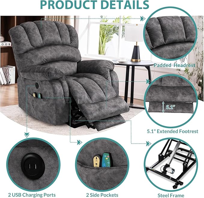- 【Humanization Design】 - This tall man recliner with 38.5inch widen fan-shaped backrest, provide extremely comfort for your neck, back and lumbar. The electric lift chair has dual USB outlets that keep your must-have device fully charged and close to you. Meanwhile, Dual side pockets for small items within reach. (Notes: The USB ports ONLY for low-power devices, such as iPhone, iPad)