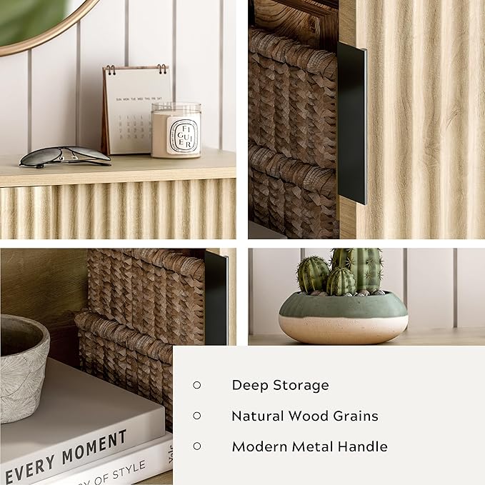 - 【Timeless design】 Boasting a smooth sliding modern panelled frame design and classy black handles, it is meticulously crafted with particle board and enveloped in a high-quality laminate. This not only ensures durability but also showcases an enchanting wood grain design pattern. A fluted door design and breathable storage with sliding doors, imparting a soft and inviting look to your space