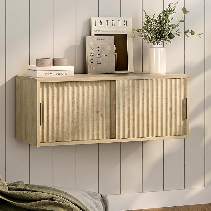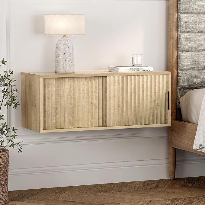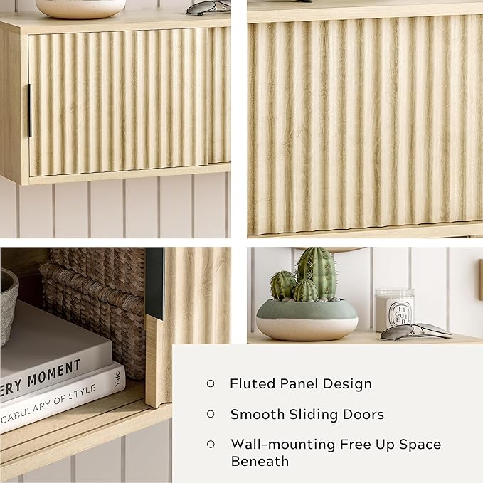 Fluted Floating TV Stand Set of 2, 30" Multi-Purpose Modern TV Display Shelf Console Entertainment Center Cabinet with Sliding Doors for Bedroom Living Room Entryway, Light Oak