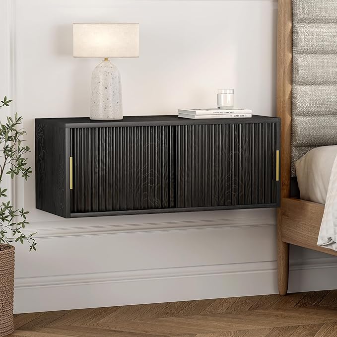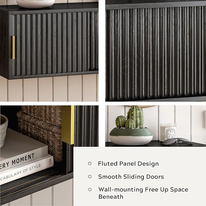 Fluted Floating TV Stand Set of 2, 30" Multi-Purpose Modern TV Display Shelf Console Entertainment Center Cabinet with Sliding Doors for Bedroom Living Room Entryway, Black