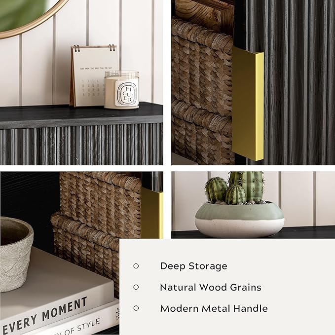 - 【Timeless design】 Boasting a smooth sliding modern panelled frame design and classy black handles, it is meticulously crafted with particle board and enveloped in a high-quality laminate. This not only ensures durability but also showcases an enchanting wood grain design pattern. A fluted door design and breathable storage with sliding doors, imparting a soft and inviting look to your space