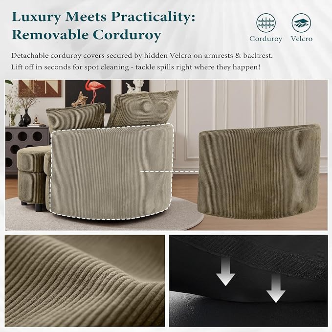 Swivel Accent Chair with Ottoman Comfy Reading Chairs for Bedroom Modern Corduroy Arm Chair 360°Swivel Barrel Chairs for Living Room,Apartment (Brown, 2)