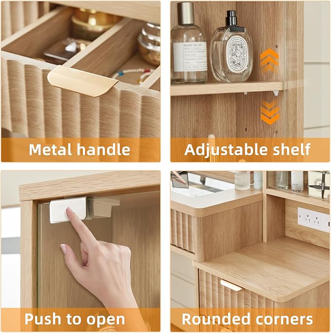 - Fluted Vanity Desk : The makeup vanity features an exquisite groove texture, exuding a premium feel.With a large mirror and adjustable lighting, this fluted-style makeup vanity looks flawless from every angle. The built-in charging station allows every woman to style herself while watching her favorite shows. The light from the illuminates the HD tempered glass surface, making your watches and jewelry in the drawers sparkle brilliantly.