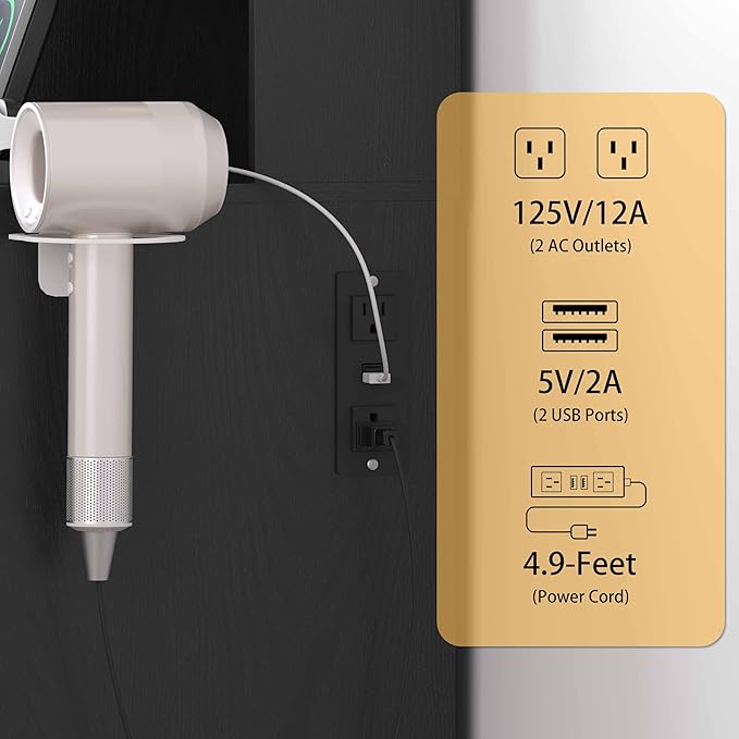 - 【Makeup Vanity Desk with Charging Station & Hair Dryer Holder】Designed for convenience, this vanity desk with drawers and mirror includes 2 AC outlets and 2 USB ports to power your hair dryer, curling iron, phone, or beauty devices. A dedicated holder keeps your hair tools organized and ready.